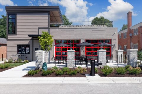This modern event venue is housed in a completely renovated 1950s firehouse with upscale finishes, rooftop terrace with amazing views, and two glass garage doors open to an enclosed outdoor dining patio.